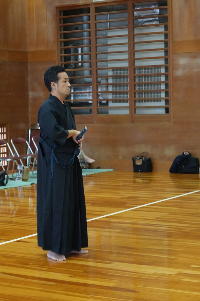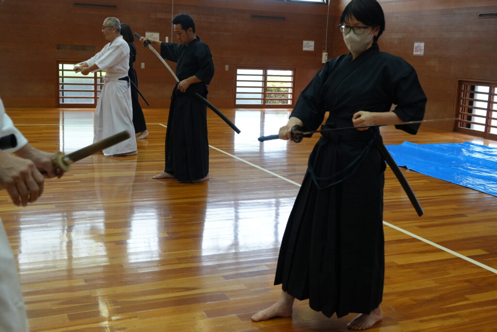 参加者は道着を着て半日入門していただき、居合刀を使って素振りの稽古を行います。